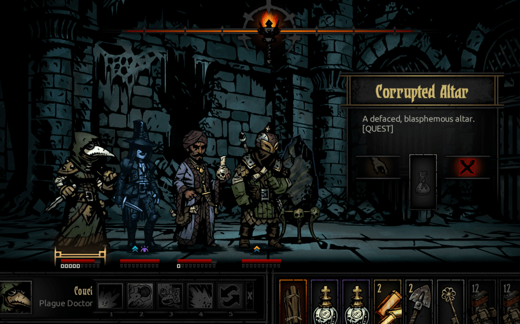 The Leper? They seem pretty strong, at least with the default load-out on the one I got. A strong but low accurate strike, an attack that sends an enemy back, a self-heal that also heals stress for sustain… truly, a powerful warrior. This was strengthened when they got the “Weapon Tinker” quirk at the end of the mission, which decreases the weapon upgrade cost for them, which is pretty much asking me to stick by them for the foreseeable future.