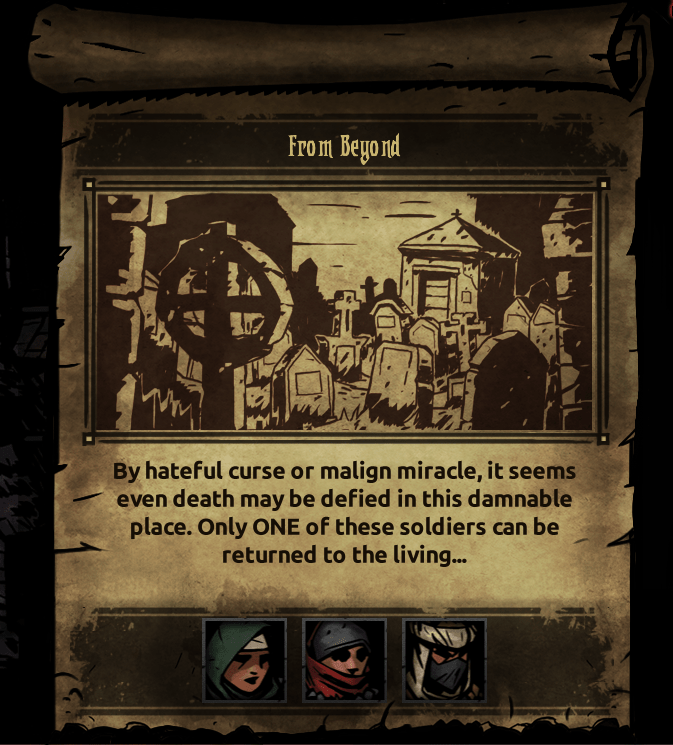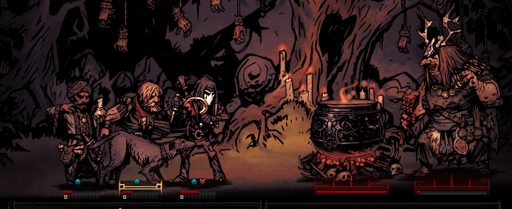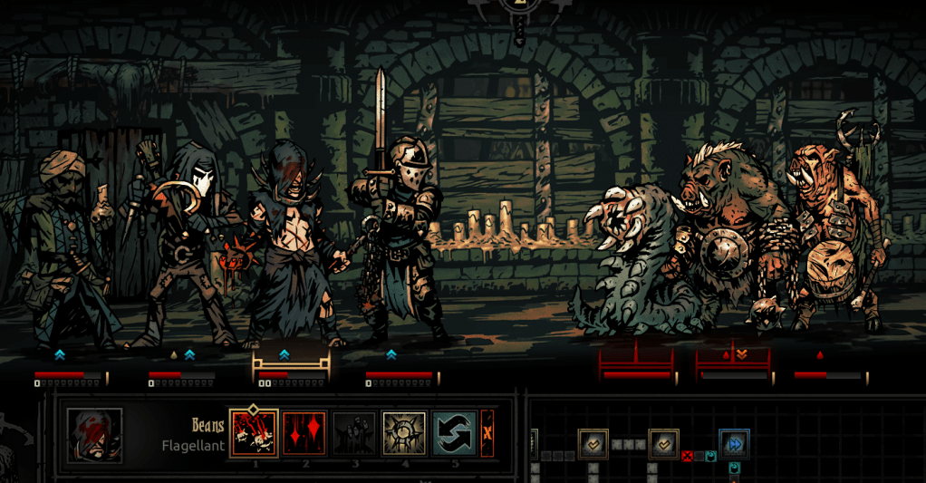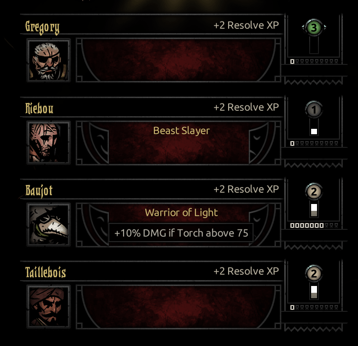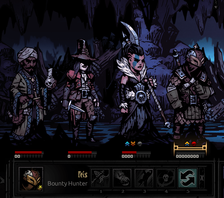 Dismas led the front, because I think Highwaymen are pretty versatile with regards to movement. Fou took the third position, because at one point during these quests I got him a trinket that made him better at bleeding and he took less stress in the Warrens; plus, if the Hag dragged him up, he could immediately punish with a Finale. Fritz the Houndmaster was chosen to give accompanying bleed, along with a stun if he was shifted to the front; furthermore, I think his set of camping skills is too fucking good, just look at that skill icon. Mantel was chosen as the Occultist of the day, and I chose to swap his mark out for a stab if it ever came to that.