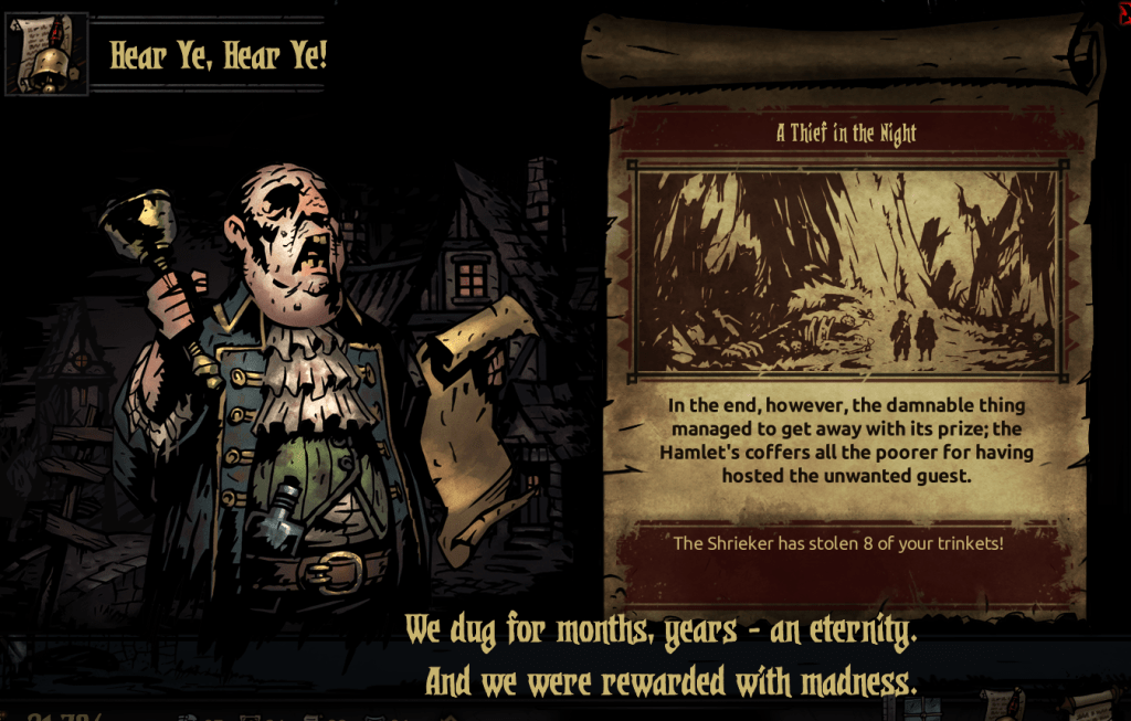 I kinda got bummed out, so this is where this installment of my Darkest Dungeon adventures ends. When things continue, it’ll be in two weeks. I’m aiming to make this a bi-weekly thing that alternates with other stuff I’m writing for the site, so there’s always at least something to read. Hopefully, it’s a schedule that will work for me. And hopefully, I’ll do a Champion mission where everything turns out alright.