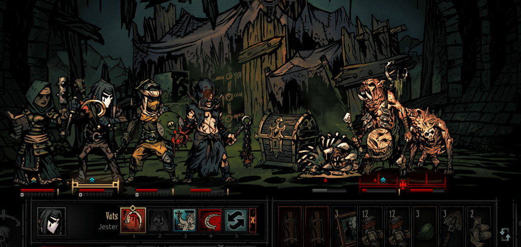 I wanted to play things a bit risky, so I decided to take a long apprentice mission into the Warrens with the rookies. Leading the front was Pipin the Shieldbreaker – sure, they’ll get attacked by her ghost snakes when she goes to sleep, but hey, the Shieldbreaker is fun to use and I have to get rid of these nightmares eventually. Ozzy the Flagellant and Vats the Jester tagged behind for the sake of bleeding those pigs, while Boteler the Vestal – soon to no longer be a rookie – joined in for some healing.