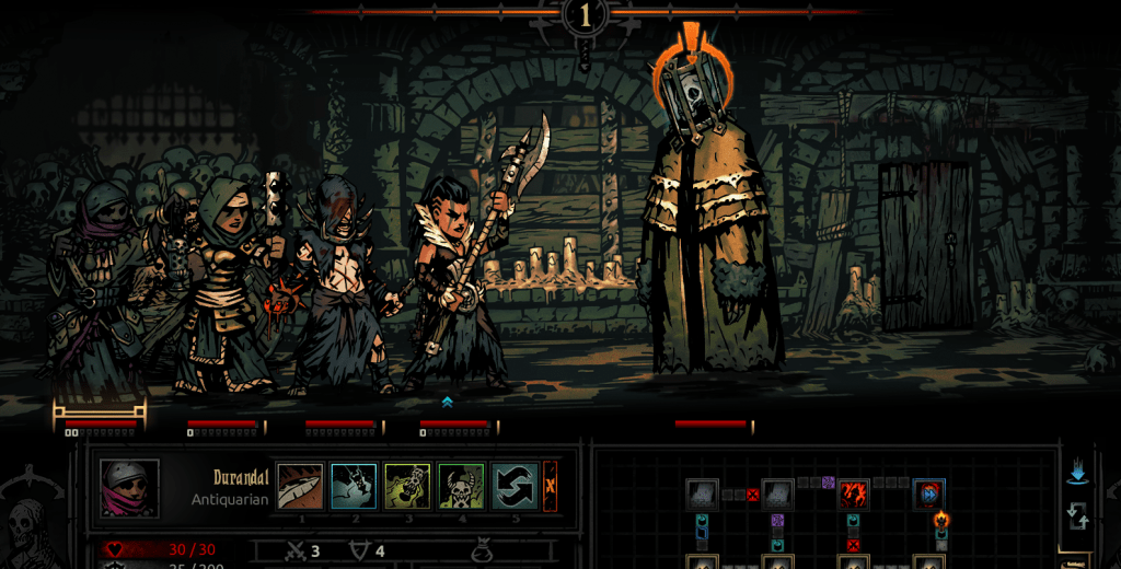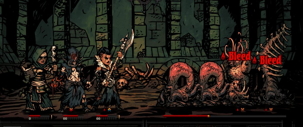 Peis was finally sent to spend time with his partner and Cairon teamed up with Vats to go gambling since Vats also has a terrible gambling addiction on top of everything else. Meanwhile, an expedition was set up to fight the Unstable Flesh back down in the Warrens. Beans the Flagellant was chosen to lead the pack since the denizens of the Warrens seem vulnerable to bleed, and since Boteler was getting diseases fixed, her expert Vestal counterpart, Cambrai, was chosen as the designated healer. Aubert the Hellion joined to provide more bleed and uhhhh, hey, since experts are helping out on this mission, I said “fuck it” and decided to give the last slot to Durandal the Antiquarian so we could get more money. Besides – I spent way too much upgrading and healing everyone, so I gotta get that money back somehow.