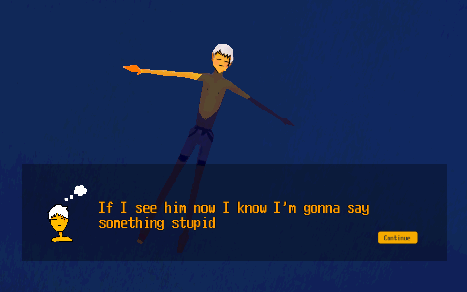 MOONYOLK is a pretty short game by Xiri, who specializes in making a lot of short games about gay identity. In this short visual novel, a young man bears witness to a cosmic horror story unfolding, but it’s in that universal connection that he finds a connection to the roommate he loves. It’s short and sweet, one of those things that I’d say “why not take the time to look at this, anyway?” If you enjoy it, the rest of this creator’s works seems to have similar vibes.