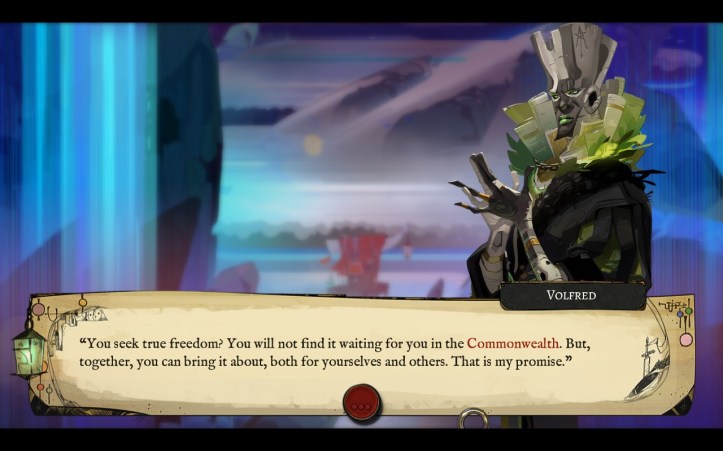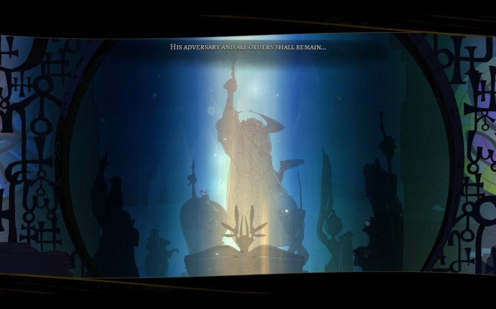 If you’re into Pyre solely for the visual novel segments, you may find the Rites to be a turn-off, because while I find it enjoyable, it’s definitely going to be alienating. Usually, games with big visual novel segments have gameplay segments that are just as slow paced, like turn-based RPGs or puzzles, so it’s easy to slot right into those modes. But even if that’s not the case, there’s usually options to make it so that you don’t have to interact with the gameplay as much; later Supergiant game Hades, of course, has the customizable difficulty for people that just want to do all the story stuff.
