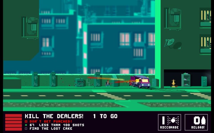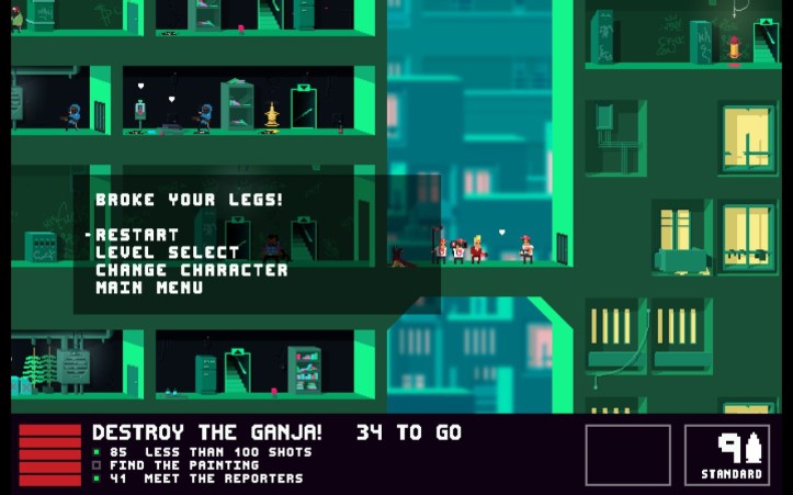 Not a Hero is a 2.5d cover shooter with a lot of fast-paced action.The level architecture is scattered with objects and doorways you can take cover in with a simple slide. When in cover, you’re mostly immune to damage coming from the direction you’re covering from. However, this does not protect you from a guy simply walking up to you to knock you out of cover, which will almost always lead to a quick death from a point-blank bullet spray.. You don’t die in one hit and your health can regenerate so you have some breathing room if you catch a few shots, but a full spray from a machine gun is pretty much an instant kill, so you gotta make full use of that cover.