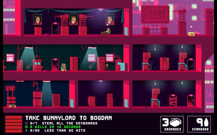 What are the themes of the game? Does it love extrajudicial punishment? Well, as stylish as the violence in the game is, the game isn’t exactly pro-killing criminals. Bunnylord and his fun club are pretty much a gang of fucked up losers. Based on some of the level briefings, the criminals you’re killing are rarely actively doing anything bad; for the most part, you’re just swinging into their operations unprovoked and if anything, they’re just fighting in self-defense. Some levels even have the added complication of a SWAT team swooping in to fight you for your crimes; I mean, I protest the fact that the police are actively heroic in this game as if Bunnylord isn’t some supercop that’d probably be given the Punisher treatment if it was real life, but whatever.