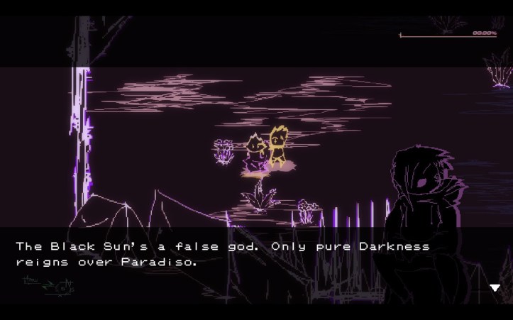 Death of a Wish is largely similar to its predecessor, being an action RPG of rough drawings striking at each other with colorful streaks. Corruption gradually ticks up, presumably dooming Christian to a bad ending in the full game, though doing good at battles will fight it back. You fight with mantras that change the nature of your strikes, building up charge for your little familiar buddy to draw on for its own attacks.
