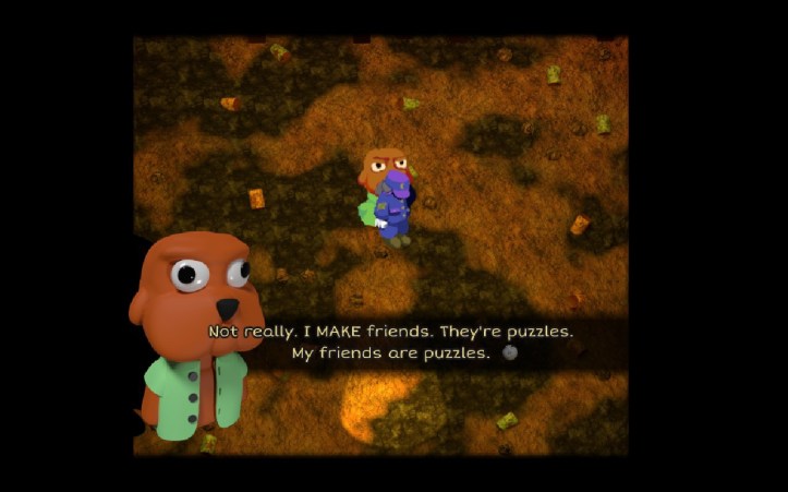 There’s a little bit of danger on the island, but they’re easy to deal with. The most danger comes from dealing with the antics of Johnny Puzzles, who forces the player to deal with his nonsense puzzles, which relies on the mon abilities you gain. He also fights you like an asshole, which flips the game to being an action puzzler where you have to figure out how to use those abilities to hurt him; I did say that small things mean a lot to some people, and for Johnny Puzzles, it’s all puzzles, baby. They’re simple fights, though it’s a step up from the usual gameplay loops. This will probably be the one place you’ll end up using consumables outside of sustaining your whisper farming endeavors.