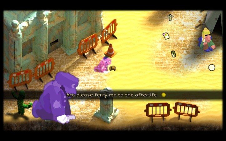 Toast is essential to progressing the plot, though it doesn’t seem big in itself. However, almost all the toast in the game are gifts to show appreciation to Home. 24 Killers is very much a game where small things like that hold a lot of meaning. There’s the taxi that represents the will of its former driver, which Home uses to drive ghost mons around to encourage them to pass on. There’s a birthday card that more important NPCs sign to get the local workaholic to take a break, a coffee bean that rouses the spirits of a mon that was losing it over desertification harming his livelihood, certain pieces of furniture that reminds some mons of what they once were… Small things can mean a lot to some people, and in a sense, even the dirt simple whisper collecting minigames play into this, as they contribute to the creation of a new world. And for Home, it’s a game about encouraging him to take his time and enjoy the little things in life. Really, that’s the freedom he’s looking for.