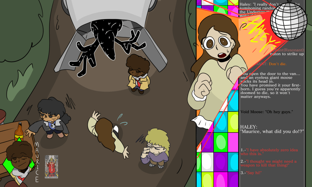 That’s not to say there aren’t any friendly faces to hang out with. There’s Haley’s caring dads who also come to support KC’s transition that are a nice contrast to Charlie’s dad, a flawed guy trying to understand his daughter being a lesbian and also the fact that she’s involved in insane supernatural drama. Outside of family, there’s a wide variety of weirdos, like a talking street, a boy trying to teach ravens the dictionary, scary weird girls of the complimentary and derogatory varieties, and sad pathetic boys of the complimentary and derogatory varieties. The best NPC though has gotta be Flannery. I support her scientific crimes against the laws of nature and I say it’s worth chasing after the Maurice/Flannery/KC-Haley achievement, because love probably won’t make her normal – but she deserves it. Only a few deserve love, the godly re seeve the good lief and whatnot.