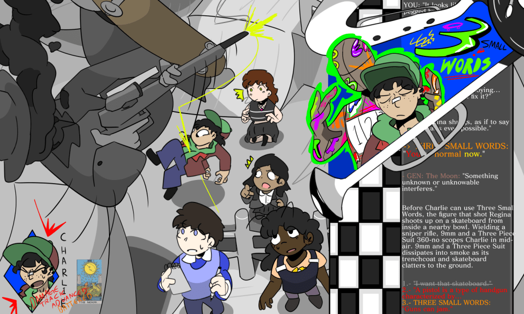 Fast forward a few decades. A new millennium is oncoming after a decade of ska, in the same place, in a better (?) time. Charlie O’Neil, Melissa Chambers, Regina Rosenthal and Naomi Shirogorov make up the latest generation of the high school’s mystery club, with the goal of solving a decades long mystery: what happened to the DISCO cast? In investigating, they stumble on the ruins of the toy shop that granted Eidolons where they come into their own. It’s through getting eidolons that they realize Charlie’s pet beetle from school is a sentient Eidolon-user named Solaris Apogee LVII 4th House (but they just go with Charlie’s pet name Solo), Regina already had her own because of a traumatic past she dares not to think about, and Naomi’s Eidolon All My Friends Are Metalheads is like, his own guy named Jake. With these powers, they explore the events of the past, the Eidolon dangers of the present, and their own interpersonal problems.