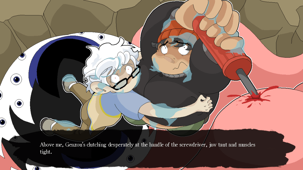 So speaking of petty violence and cannibalism, most of the horror that the game has to offer comes in the form of vicious gore. From getting ripped apart by tomato monsters in an optional game over to bearing witness to horrible canonical torture, Our Wonderland loves to splash blood everywhere. Some of it is a bit cartoonish, but other times I just had to take a break because it made my skin crawl. You can play a censored mode that lessens the visuals, but it does nothing for the text descriptions of violence, which can be pretty vivid at times. Imagining how it’d be to get different parts of my body electrocuted wasn’t fun. So Our Wonderland sure succeeds in this department.