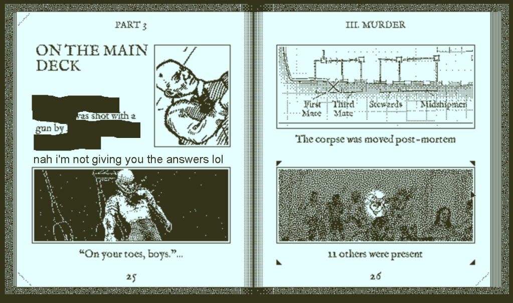 For a few weeks, I casually played Return of the Obra Dinn with one of my partners. It was a Christmas gift they got me, and dang it, it was a good gift. It was a game that made me feel like we were a detective duo, finding hidden truths among increasingly obscure clues. Now: this was supposed to just be a break game for me. I don’t want to be that girl that turns everything he enjoys in their spare time into Content. But also, due to real life problems I’ve been open with, I’m a boy with free time to burn, so why not turn it into Content anyway? Besides, let’s take a little break from The House in Fata Morgana.
