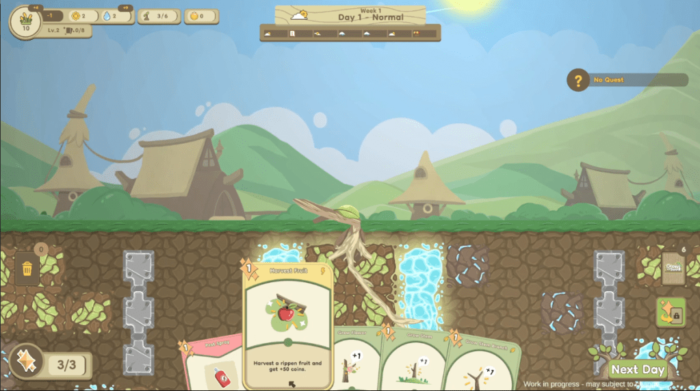 You build out which way the tree grows with your played cards, growing branches for plant life to grow on and growing roots to new patches of fertile soil – important, since your tree needs food to survive. Alternatively, if passive food from the fertile soil isn’t enough, you can absorb sunlight with all the leaves you’ve been growing on the surface and combine it with the water the roots can also suck up to photosynthesize. Besides leaves, you can also grow flowers to then grow into fruit to sell so that you can buy and upgrade cards, because it ain’t a deckbuilder without some roguelike commerce.