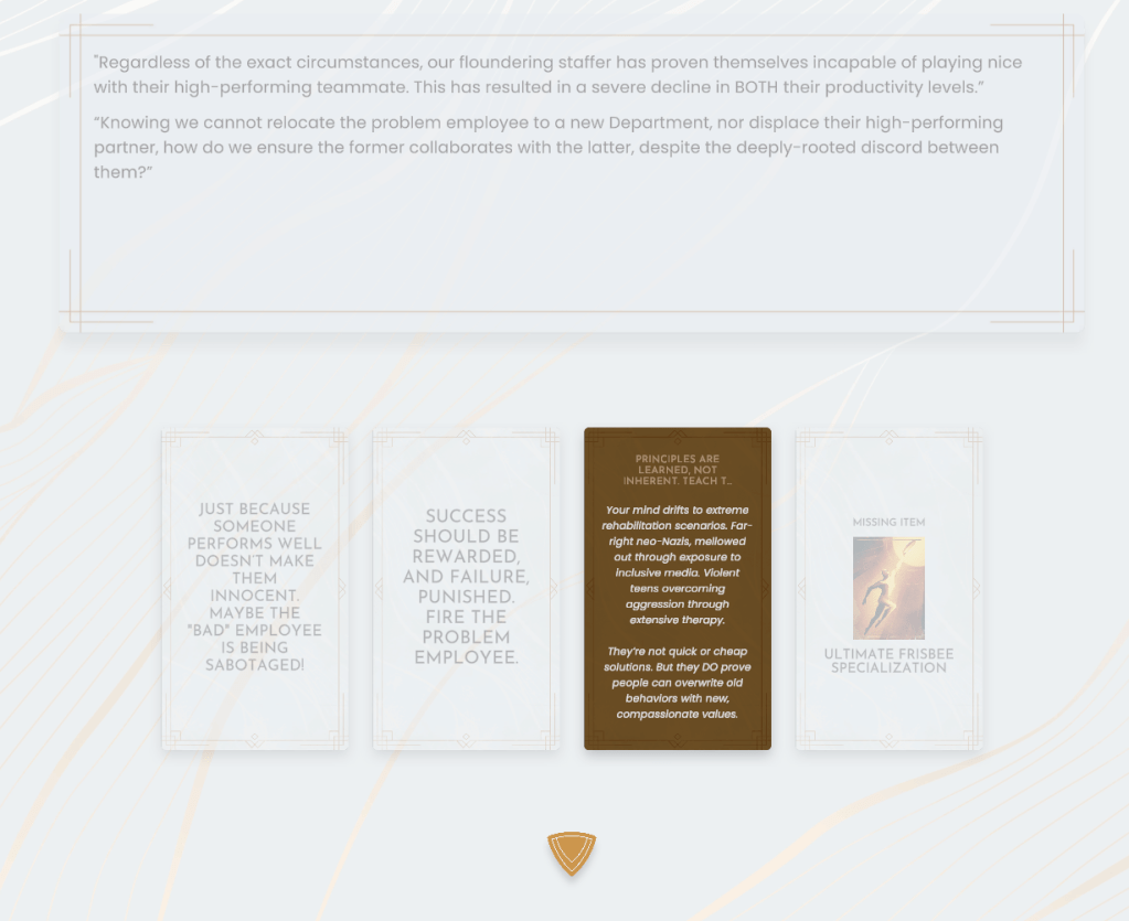 Inhuman Resources is a narrative game with lots of reading. It’ll offer you choices, and a neat thing it does with the choices is that you have to hold your mouse on them; prevents you just accidentally mashing through things and ensuring that you’re committing to a choice you’d actually want. At one point in the game, you define your character’s past, and with that defined past, new dialogue options can become open to you. It’s not quite something to the extent of something like, say, Disco Elysium, but it’s fun to read through.