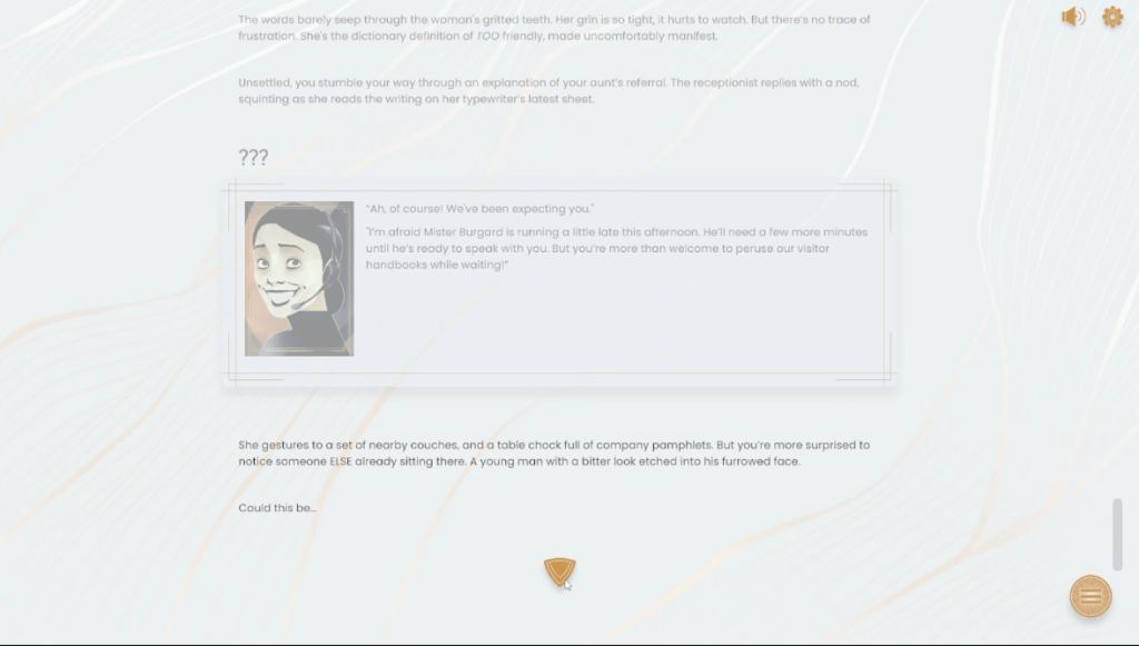 Most of the art is character portraits, which are simple but perfectly captures the vibes of whoever’s talking, like the completely normal lady having to fill in as a secretary. While normally silent, the game plays music and sound effects at the perfect times to go along with the atmosphere. The writing is sad with dark humor vibes for about the first half of the demo, but it swings all the way to dark in the second half. How? Well, just read to find out. Don’t want to ruin it.