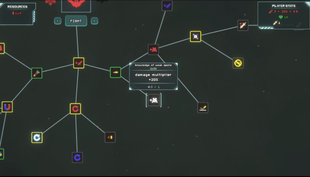 You spaceship is rather pitiful. It can beat the first boss easy, but good luck on the second. The rest? Forget about it. Now here comes Nebulock’s central mechanic: a skill tree system branching out to improve various bits and bites of the action. You’ll soon go from one sad blaster to a fast firing one that can spit out multiple bullets as bits of the enemy ship gets passively collected, piloting a ship that can better withstand the bullshit later bosses throw at you.