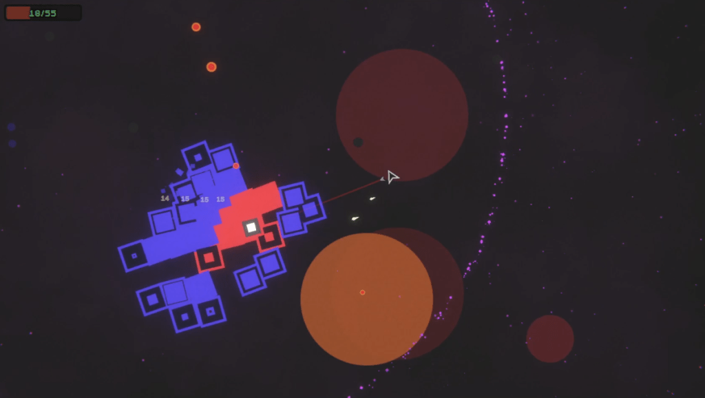 You are a good ol’ spaceship, fighting much bigger ships that unleash a bullet hell on you. These ships consist of a core that must be destroyed, surrounded by blocks that you have to chew your bullets through. Unusually, they’re not just boss body armor – the blocks are also resources to upgrade your ship.