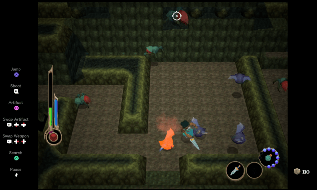 And that gameplay? “Bump slash” combat, where you hurt things simply by walking into them. Now, that doesn’t mean you’re invincible and can just walk into things willy-nilly. You have to walk into vulnerable parts of enemies to strike, and they’ll gladly reposition themselves to make things harder, and unlike Aliph of Even the Ocean, Tets does not have a shield, so you may get harmed trying to strike enemies and projectiles could chew right through you. You also have a gun and a choice of item to also fight with, but they can’t be fully depended on. Bump slashing is the only true way through. It makes for an accessible method of action combat, but not something too overly easy.