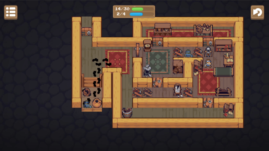 However, it’s not a full sokoban – in fact, I’d like to think of it as a reverse sokoban. By the time Olaf came to, everything’s already been pushed into place, objects smashed. In this game, instead of pushing things together, you’re pulling things back in place. Furthermore, when you move into broken objects, they get fixed and wind up blocking your way, essentially playing out as you making your way backwards through Olaf’s drunken endeavors. Normally, I’m not too into sokoban, but I think the goofy reversal gives it a fun spice to me. It’s honestly making me want to pick Void Stranger back up.
