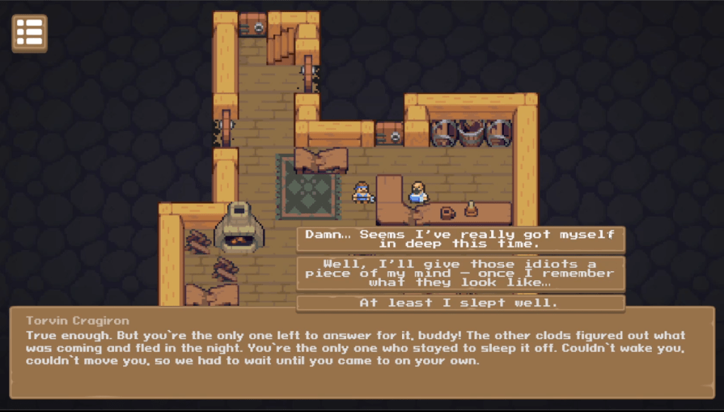 There’s also a lot of writing in the game. Now, I did say that a game adding writing to it helps it establish the game’s identity, like, literally a few hours before I touched this game. And the writing really does succeed in establishing Olaf the Boozer as a goofy fantasy sokoban. I do feel that some conversations go on a bit too long and need to be trimmed down, though.