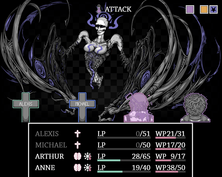 Let’s start things off with Frail Hearts’ strongest aspect: its aesthetics! Frail Hearts has a strong monochrome art style with splashes of color to add a little liveliness. Beyond establishing a horror atmosphere, the monochrome stylings lend the setting a sense of dreariness. Gris is a city standing in the aftermath of a war with an active criminal underworld, and the art style makes Gris out to be a miserable place. As for the supernatural, the monsters have pretty great sprites. If you’re going to make a horror RPG, the monsters gotta look fucked up, and Frail Hearts delivers.