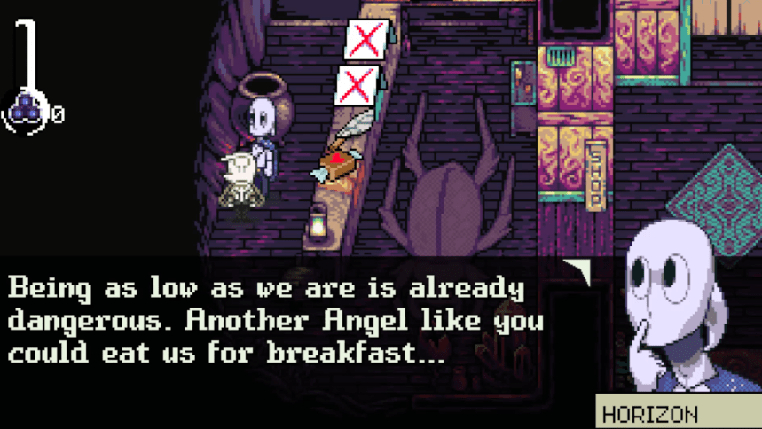 You are Blank. No, you’re not a character you can rename. You are an Angel that lost his sense of self, including his own name. Somebody attempted to kill Blank, and while he seems to be blessed with the power to never truly die, his brain is gone. And so, he leaves his house on a quest to reclaim what was lost.