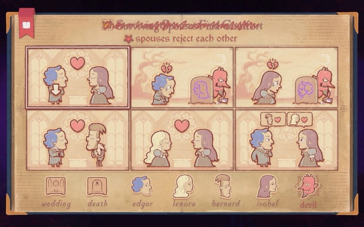 Each level has you being given a simple goal (and sometimes a secondary one) with a selection of actors and scenes. Heartbreak is a simple story where you make Eve of Bible fame die heartbroken. It’s an easy story where you wed Adam and Eve first, have Eve react to Adam’s grave, then just put Eve’s grave. Skip the wedding or mess up the panel order and Eve just shrugs at Adam’s grave, or give her a little spook with Adam’s ghost on the wedding scene. You’ll probably gain nothing from it, but it’s nice to play around to see how Storyteller’s systems work.