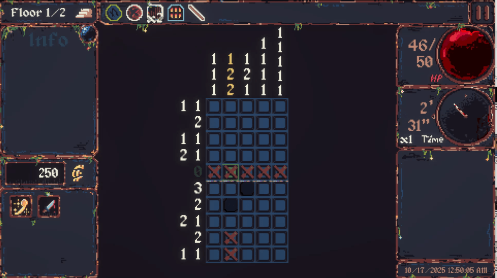 The rules for CiniCross is easy to get. Ever play Picross? The game’s a variant of Picross. Just cross off all the squares in accordance to the number hints on the sides of the puzzle. The main twist though is the timer. You’re constantly on a timed mission, and as soon as the timer’s out, you start to regularly take damage. The timer persists through levels and a bit more time gets added when you solve a puzzle, so you better be quick with things, especially since later floors decrease the timer faster.
