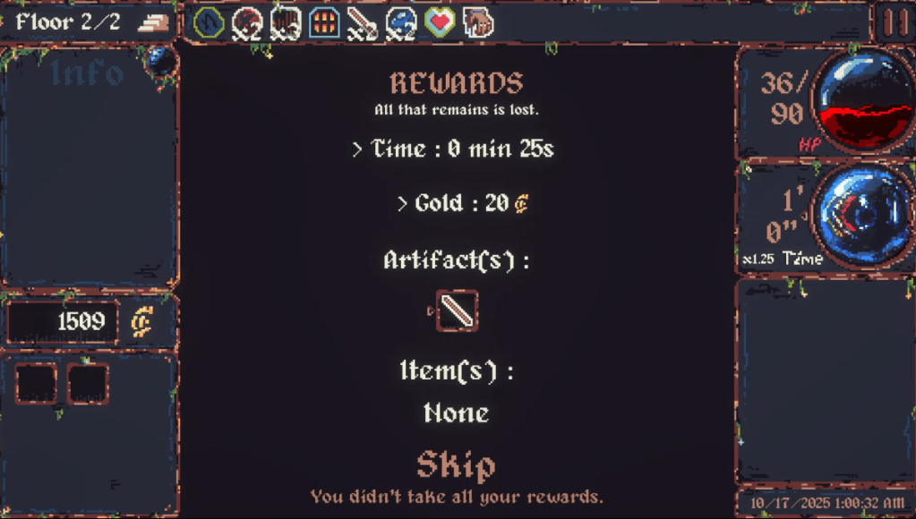 The main roguelike elements are passives that you’ll gradually build up to help you and active items to use, like a sacrificial dagger that adds a bunch more time to the timer in exchange for HP. The advantages are helpful, though they’re small, so you can’t fully lean on the roguelike stuff. At the end, there’s a random boss that forces an extra rule to play around, and honestly? Fuck the Goblin for fighting my urge to flag unsafe tiles.