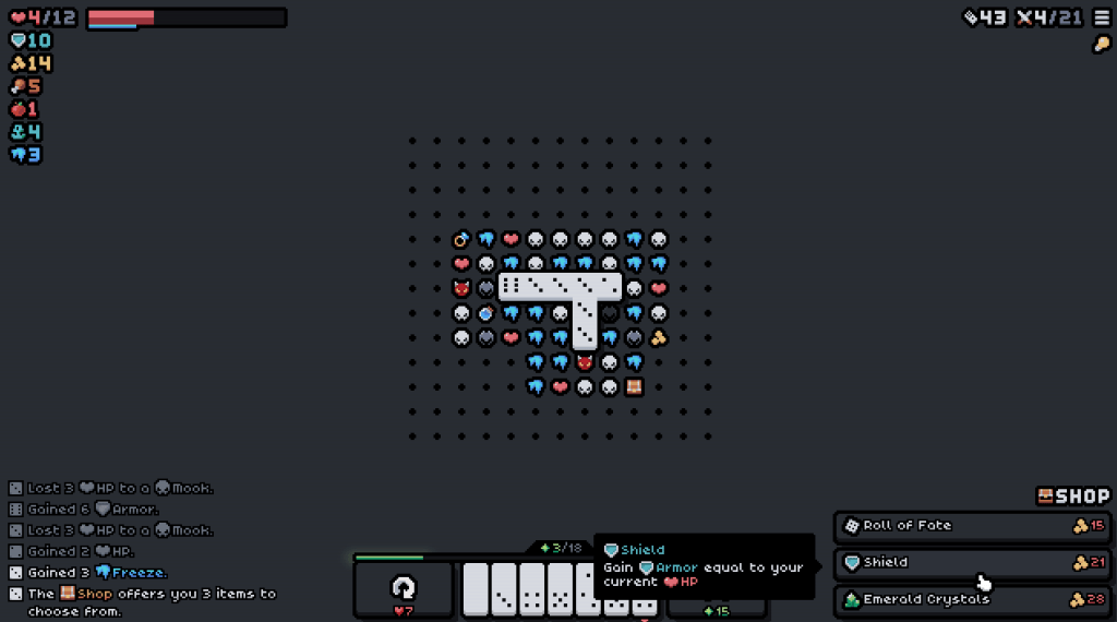 You have to lay out a certain number of dominos on a board before you can move to the next level. When a domino is placed, the effects of the tiles is multiplied by the number of pips on the bits of domino laying on them. A 1/6 domino carefully placed on an enemy and recovery will have you healing 5 health, completely negating the health loss. It seems like a good tactic… but you have to consider what that 6 is next to. As per dominos rule, you can only extend out of that spot with a 6, and if that spot is surrounded by enemies, well, that’s a big unavoidable hit unless you have somewhere else to build out of. Just gotta keep building until you can escape – but be mindful about things.