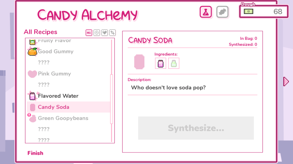 The end of the day is typically when you end up synthesizing candy. Part of me wishes that you can go to the store at the end of the day, but then again, there’s no real penalty to just going to the next day. The store management isn’t on some Recettear type stuff, Pastille handles the economic side of things offscreen. Overall, the game just intends to be a relaxing experience, even if there’s a few narrative things that troubles some characters. I’m normally kinda eh on this stuff, but well, I’ve spent too much of this year looking on the blight side of life. Everyone really needs something cozy these days.