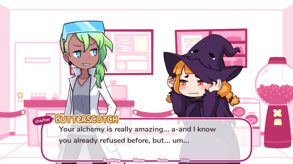 Everyday Syrup sets out to do some work in the world, and she can choose who she wants tagging along with her on that day. When you go to areas with a character new to it or certain conditions are being met, they’ll chat things with Syrup. Pastelle embraces magic more and Syrup encourages him despite her dislike of magic, Gumdrop gets to see more of the world, Butterscotch still has an extremely tsundere attituide toward Syrup that I live for, and so on. It’s fun to read, and I liked catching back up on these characters’ deals.