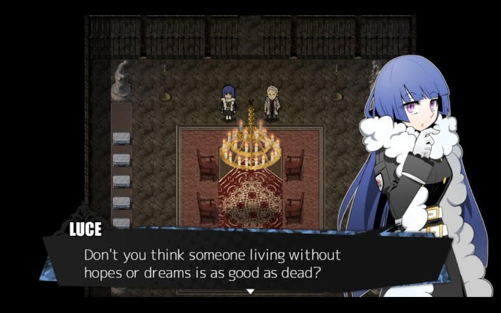 On a technical level, the latter half of Noel is a bit all over the place? The eighth part of Noel immediately gave me a bad impression because the translation work wasn’t as strong. There are just floating ellipsisus all over the place, and I can tell that whoever did the translation work just copy-pasted dialogue into RPG Maker MV because the same weird text glitch happened to me with my own work. Meanwhile, as a whole, the translation for “Laplace” just keeps bouncing around.