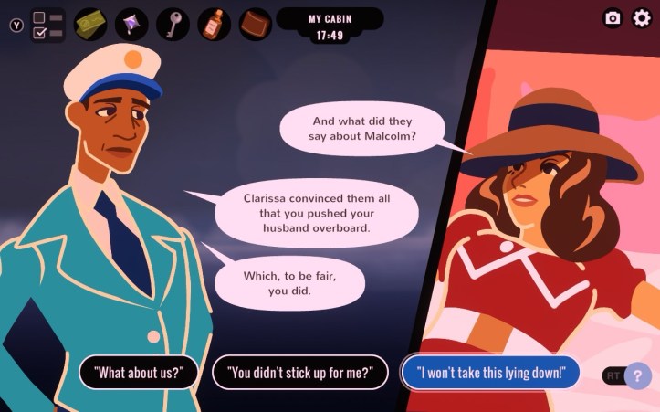 While you’re reverse Columbo-ing through things, the other passengers offer smaller stories. Carstairs is a guy that will discover evidence of Veronica being where Malcolm was last seen. You can simply steal it before he finds it, but he’s got some weird things about him that you can find if you dig into him that’ll lead to an alternative solution. Lady Armstrong’s a big help toward investigating other characters, because she simply loves to gossip… which also might be bad for Veronica. Those sleeping pills Veronica can get and Armstrong’s tendency to drink sure seems like a tempting mix. That Major is a snoop in his own right, while the ship’s captain Anders will happily keep secrets – just gotta flirt with him a little. Clarissa, meanwhile, is the biggest hurdle for Veronica to cross and the most closed off character, but Veronica can deal with her in different ways…
