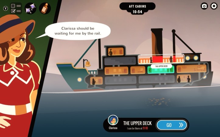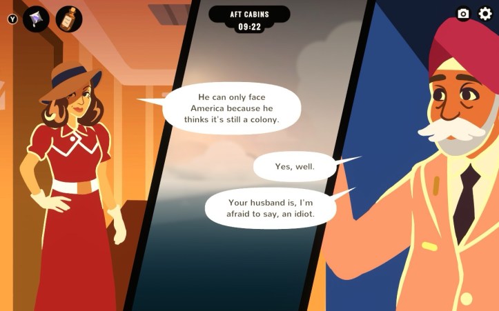 It’ll take the ship a few hours before it reaches America. Walking around the ship and talking to people will drain time, and for the most part, the game will end when the ship reaches port, where the Major on the ride holds trial regarding Malcolm’s disappearance. Complicating things though, is that Clarissa, another passenger who had a bit of a fling with Malcolm, witnessed Malcolm’s fall and believes Veronica to have been responsible.