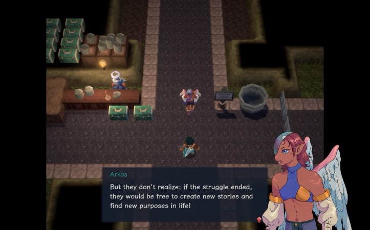 Angeline Era‘s story structure reminds me a lot of the first Anodyne’s. They’re both initially presented as straight-laced adventures, and then things get weirder and more metaphorical. The local plot coupons that Tets is asked to collect are initially gained through straightforward fae bosses that are presented as the local evil lieutenants, but afterward, they’re obtained from outsiders with different pursuits.