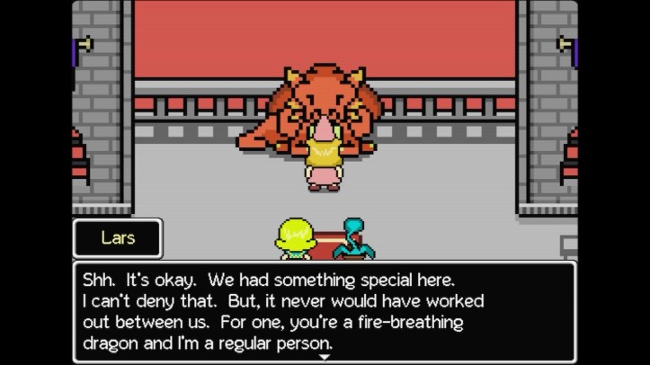 I also kinda have a new read on Lars that I didn’t really think about when I originally played: is Lars trans? In Lars’ introductory arc, he’s dressed up as a princess to appease a dragon. And Lars… is actually treated well for it. He’s considered to be pretty by other characters, and there’s barely any confusion about a man in a dress. Lars is comfortable in the clothes, and Helga straight up has to remind her sibling to take the dress off. Lars having a relationship with a woman dragon? I know of some sapphic trans fems that would be all over that.