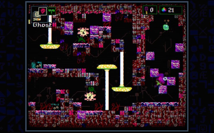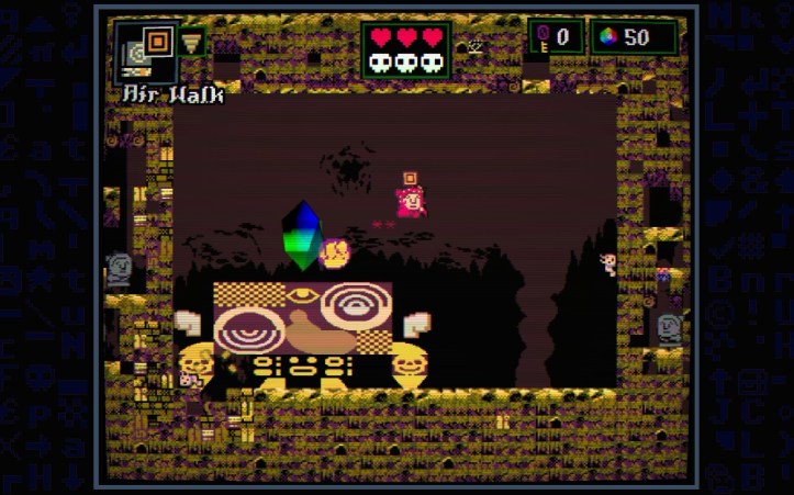 So, those powers! Besides having a broom to whack things, you can get powers through interacting with totems. In a way, they all fit within the glitch theming of the game. The high jump/slow fall power can be seen as a manipulation of a game’s gravity. The air walking power follows a similar mindset, where the game forgets that you have to drop to the ground when you walk off an edge until you jump. There’s a nice wall climbing power that lets you treat walls as another floor. Then there’s ghost, which lets you clip through things that’d normally kill you.