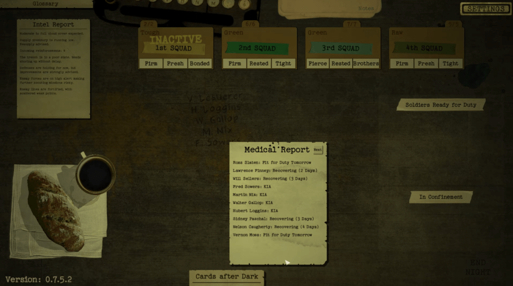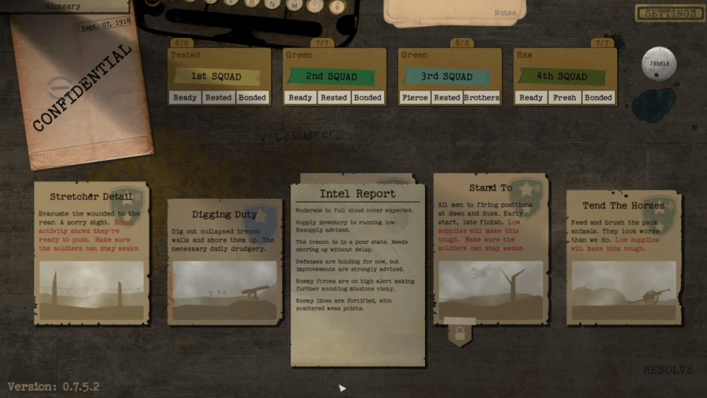 In Acceptable Losses, you are a World War I officer managing the war effort from behind a desk. You manage a few squads and assign them to daily missions. You juggle decisions to maintain soldier readiness, exhaustion, and morale while hoping for good outcomes on missions. Seems easy, right? The problem, however, is that you can’t field all the missions. The war effort initially seems solid, but it will start to fray with those unaddressed missions.