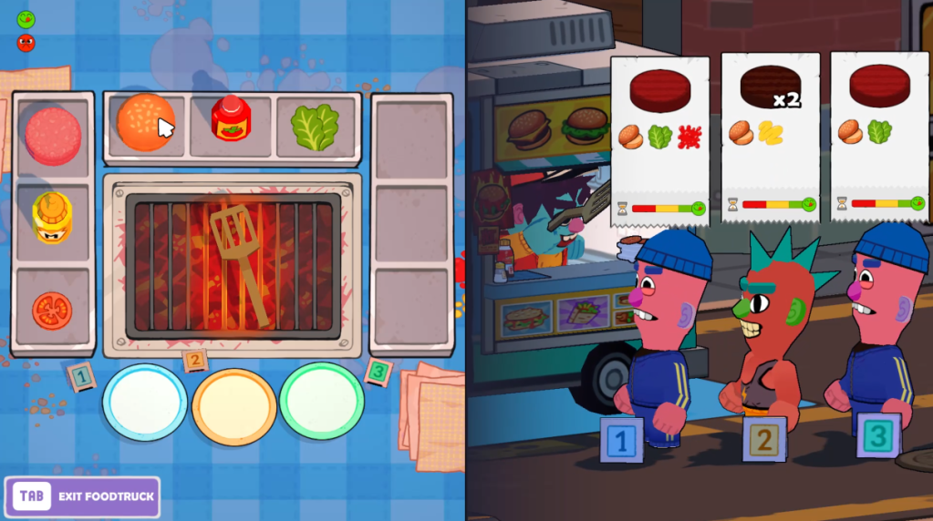 So, we step away from the fighting to get cooking. Up to three customers await on delicious burgers, specifying how cooked they want their patties and what extras they want. Cooking is easy to understand, it isn’t as stressful as the hell of Overcooked – at least within what I could play of the demo. Satisfy a customer? They’ll be out on the beat em’ up world, cheering you on with no hate in their hearts. Flub on a burger? You can bet they’ll be a hater.