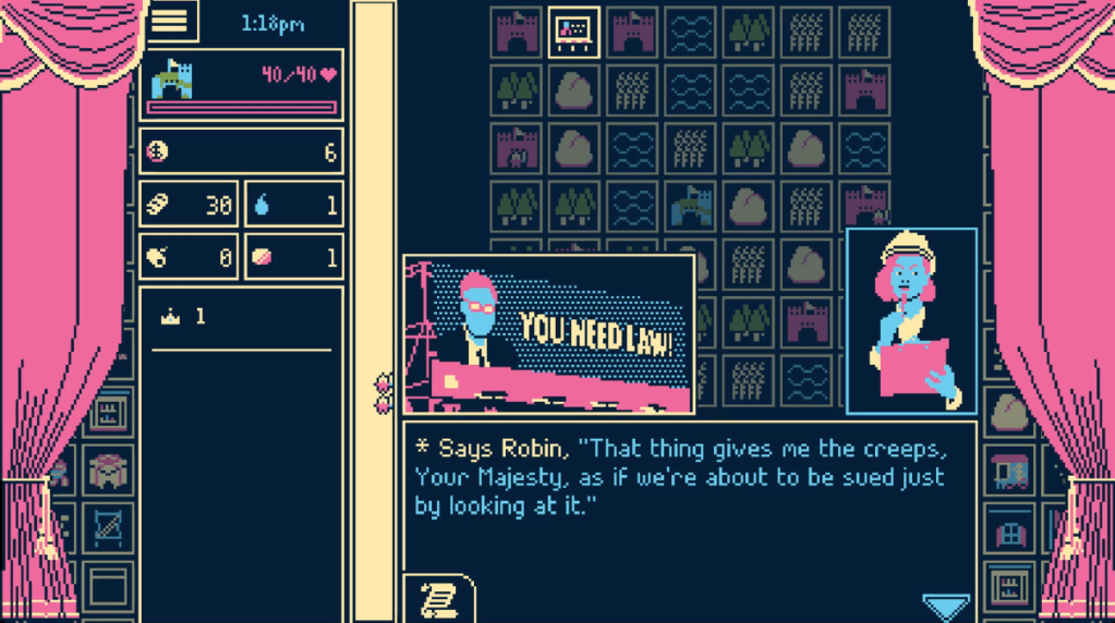 The story vibes are also strengthened by the presentation. Portraits are simple yet striking, feeling like comic book panels. Titanium Court furthers the comic book feel by emphasizing actions with goofy panels, with the conquest of enemy castles being heralded with baseball batters striking hits and the end of a low-tide being announced with a panel of a referee. And everything in the game is played under pretty chill music. Nothing high-energy, just pleasant grooves that feel like a sweet dream.