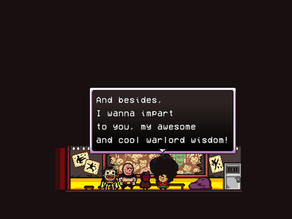 The existence of children in the original LISA world is a big question mark. Besides Buddy, the only notable child that exists in the party member Jack – who was a Kickstarter backer made character and may as well have not existed. The other children that exist in that Olathe wasteland are shown to die in some Family Guy style comedy. Otherwise, it’s all manly Fist of the North Star action. The general lack of proper care toward children kinda asks, how many of the people gunning for Buddy actually cares about the next generation of humanity, as they supposedly claim?