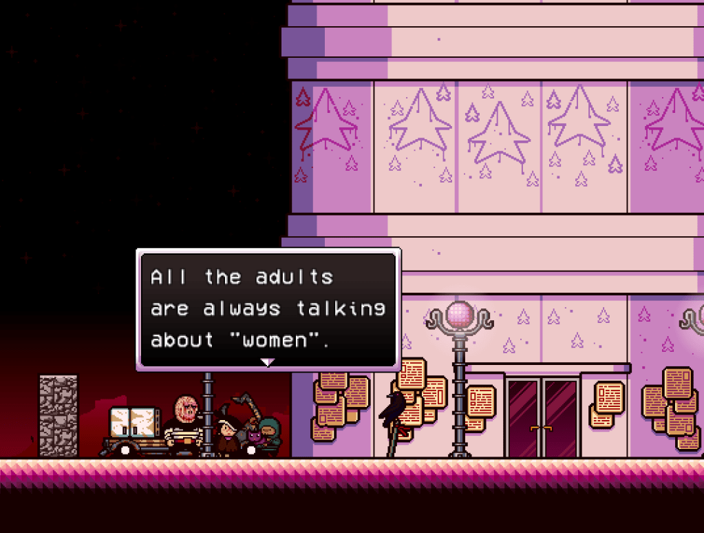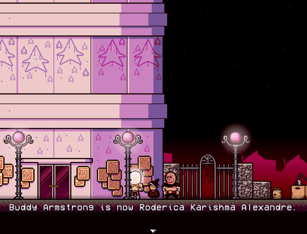The city is a very chill place. Buddy can freely wander around without a mask because nobody wants to ruin the social order. Granted, most people see her as a guy, but the people that do recognize her as a girl don’t want to cause trouble. Buddy can actually meet an out trans woman and have a proper girl-time chat with her, with the implications that Buddy is open to questioning her own gender. From looking at the game’s files, Buddy’s Hatred won’t even ruin the good times, even if it’s high.
