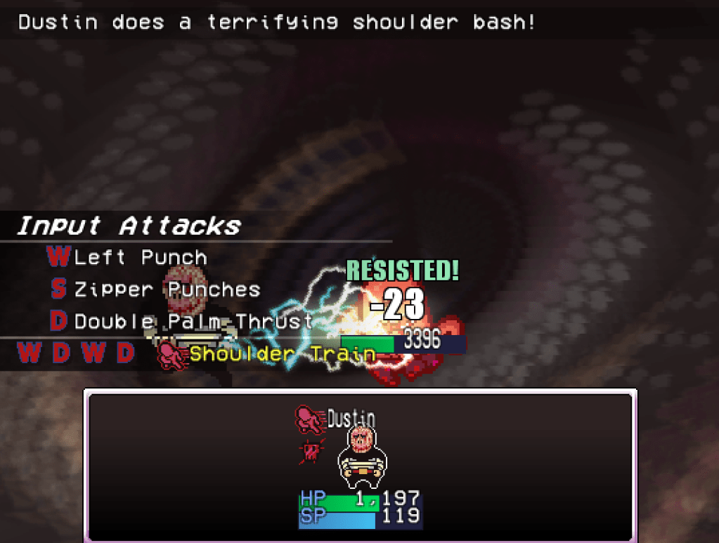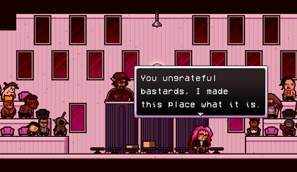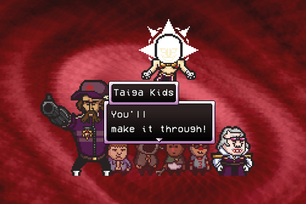The fight takes place in a courtroom full of men, but none of them step in. It’s Taiga’s children that are the ones to step up and help. Every few turns, they heal and revive Buddy and Rando, cheering Buddy on to succeed. This final boss is metaphorically a fight of a new generation against the old generation. A fight between people obsessed with their own versions of the past and people representing what could come next.