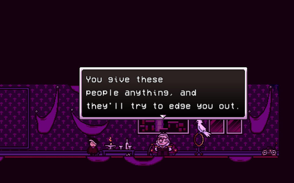 There’s a lot to see and do in Taiga, which may diverge with routes you follow. A notable thing to do is the wrestling arc. Undone also reimagines Rando a bit through establishing a past beyond his relationship with Brad Armstrong, telling that he used to be in a circus before going on to remake himself as Rando. The wrestling ring is run by the family that used to run the circus, and they’re openly abusive toward Rando and want to make his matches hell. This is also the only definitive fights I managed to get in my playthrough of the last act besides the end, helping make him stronger for that.