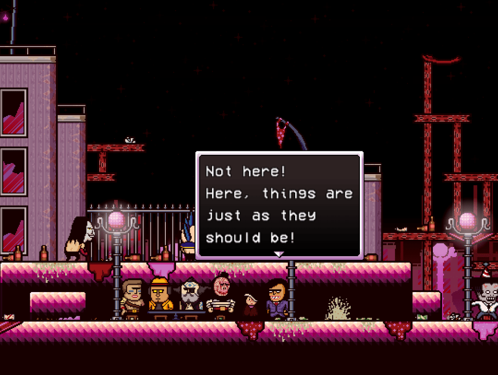 Another constant then appears. He appeared once much earlier, but Yado – the secret main villain of the LISA games – meets Buddy and Rando when they head to the court to demand proper passage out of Taiga. He has a much more active villain role in Untold and isn’t just a bizarre background presence like in Joyful – dude even ditched the gaudy polka dot fit. For the sake of his plans, Yado is summoning the Joy Mutants that Taiga cast out to destroy the city, and honestly, he comes off as more interesting than canon Yado.